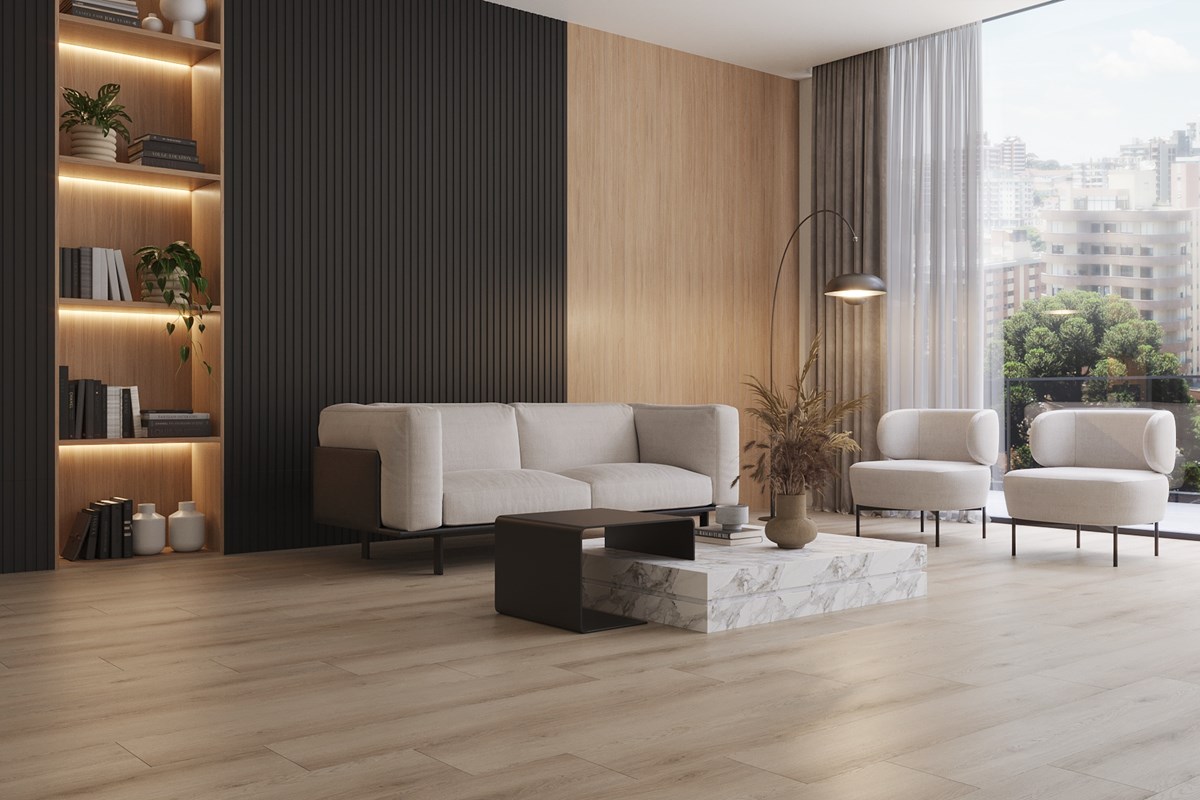Uma tendência forte na decoração é utilizar o mesmo revestimento vinílico no piso e nas paredes. Isso porque esse tipo de aplicação gera um visual mais contínuo e possibilita ampliar visualmente o ambiente. Essa solução é perfeita para ambientes integrados, como salas com cozinha americana ou, até mesmo, para valorizar pequenos espaços como lavabos e escritórios.