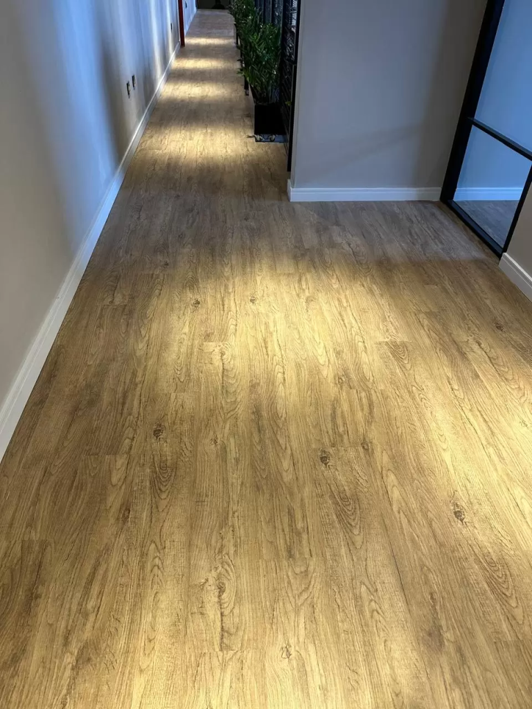 Durabilidade: está diretamente ligada ao investimento a longo prazo. Pisos de alta resistência à abrasão e com boa estabilidade dimensional garantem que o escritório permaneça bonito e funcional por muitos anos. O vinílico e o laminado são materiais que atendem bem a essa exigência, especialmente nas versões comerciais, projetadas para suportar alto tráfego e conservar a aparência original.
