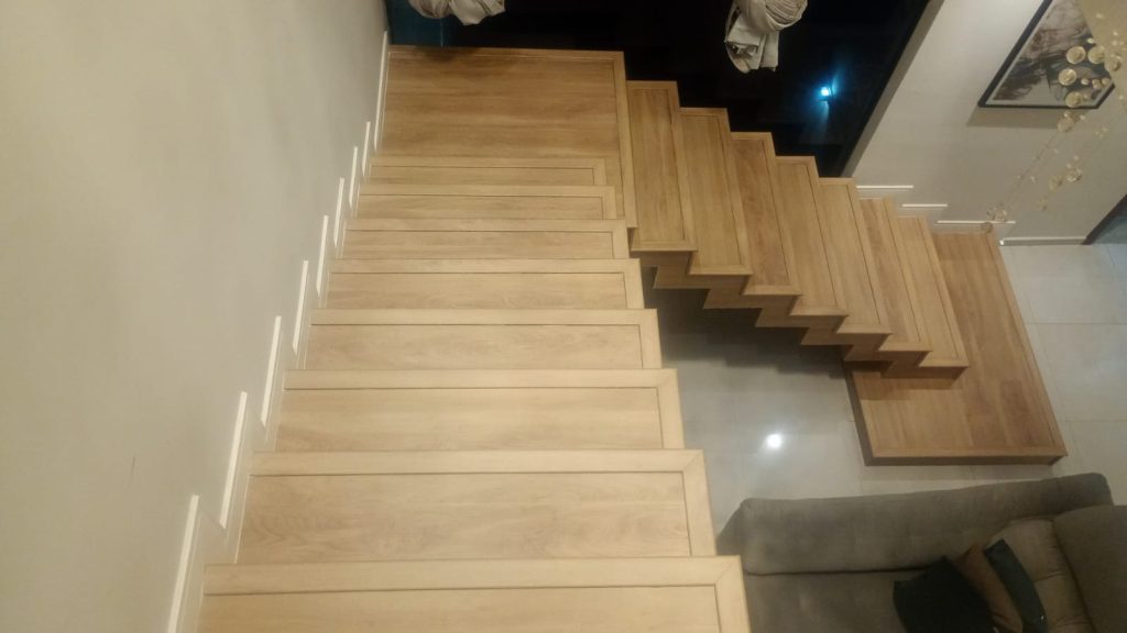 Aplicação de piso laminado em escada com a linha New Evidence da Eucafloor.
