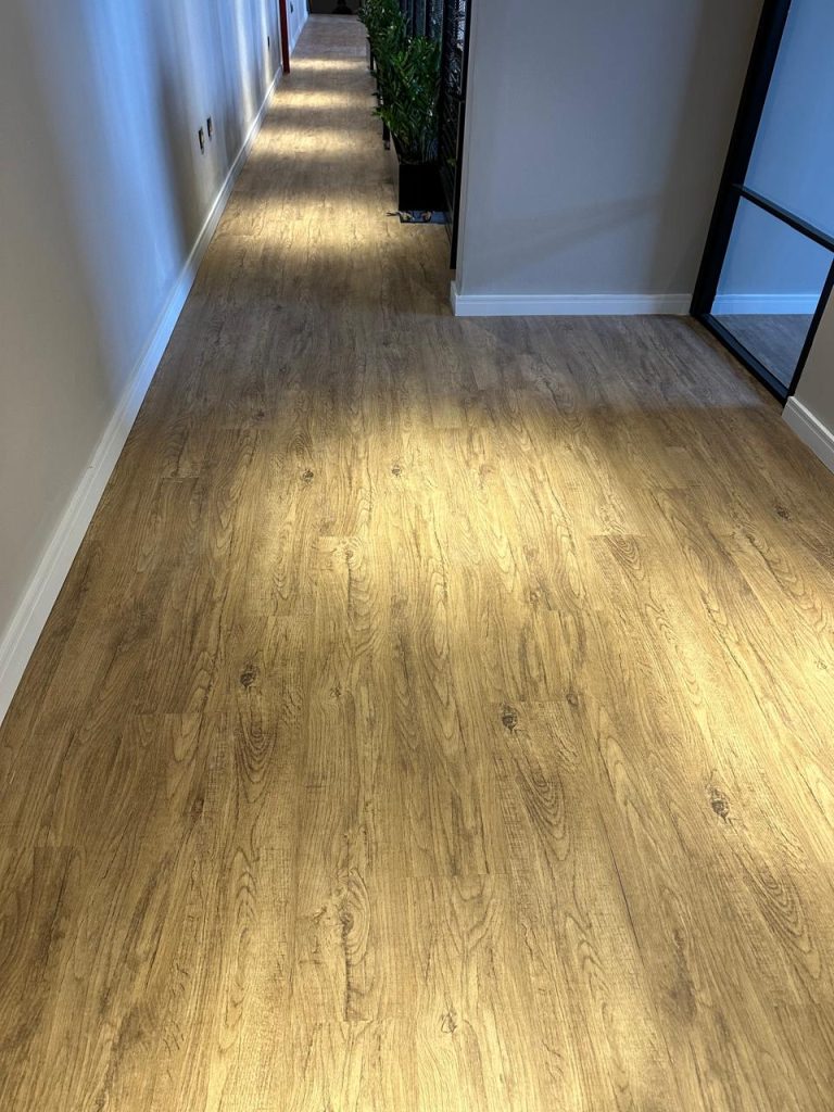 Para este projeto em uma empresa localizada na Zona Norte de São Paulo, a Estilo Decorações executou a instalação do piso vinílico da marca OspeFloor no modelo de 2 mm. O revestimento vinílico entrega alta durabilidade, praticidade na manutenção e acabamento moderno. Essas qualidades são essenciais para um ambiente mais funcional e esteticamente agradável para o uso comercial.